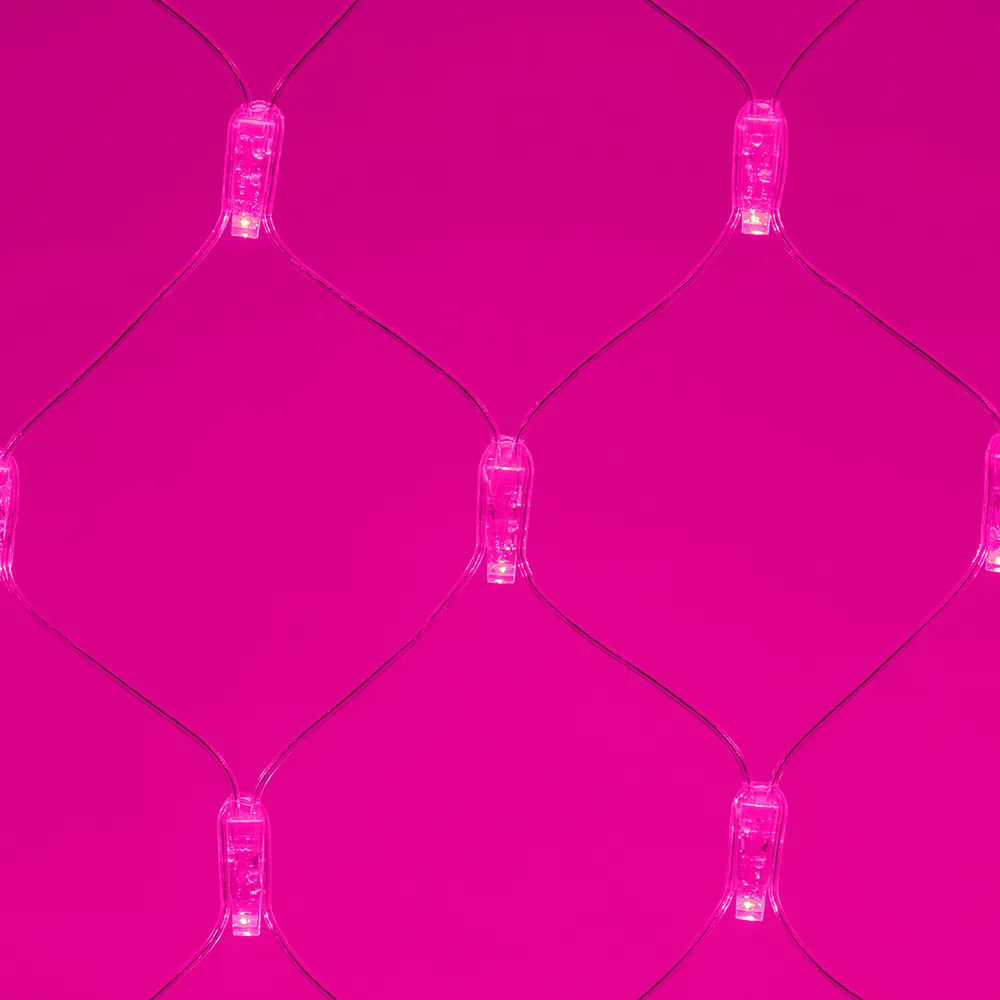 Светодиодная сеть Classic. 2000x1500 (длина 2000 мм, высота 1500 мм). Цвет свечения РОЗОВЫЙ. 288 светодиодов размером 7 мм со статическим и 8 динамическими эффектами свечения с резким световым рисунком (прозрачная вогнутая линза). Провод прозрачный, ПВХ. Питание 230 В, Мощность 18 Вт,защита IP65, применение в помещении и на улице под навесом Аксессуары для подключения и выбора режима свечения в комплекте.
