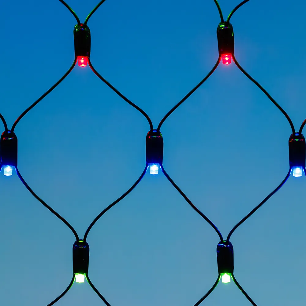 Светодиодная сеть Classic. 2000x1500 (длина 2000 мм, высота 1500 мм). Цвет свечения RGBY (светодиоды чередуются). 288 светодиодов размером 7 мм со статическим и 8 динамическими эффектами свечения с резким световым рисунком (прозрачная вогнутая линза). Провод черный, ПВХ. Питание 230 В, Мощность 18 Вт,защита IP65, применение в помещении и на улице под навесом Аксессуары для подключения и выбора режима свечения в комплекте.