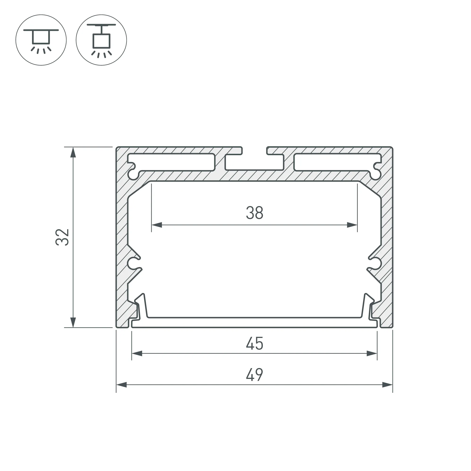 Алюминиевый анодированный профиль для светодиодных лент и линеек. Габаритные размеры (L×W×H): 3000x49x32 мм. Ширина площадки для ленты 38 мм. Экраны, заглушки и другие аксессуары приобретаются отдельно. Цена за 1 метр.