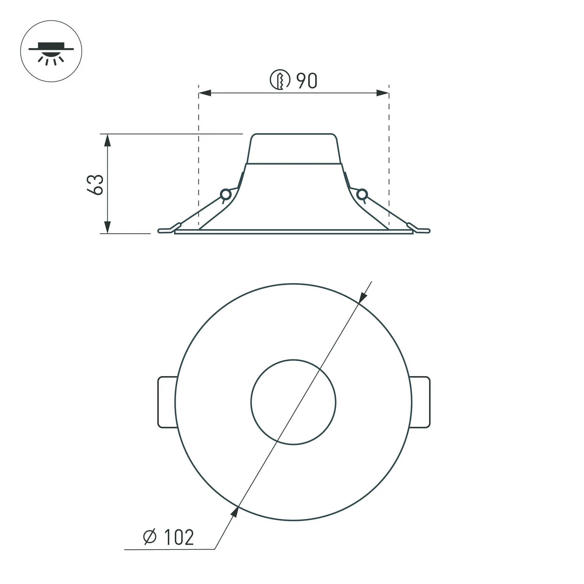 Встраиваемый светильник даунлайт с интегрированным в корпус драйвером. Мощность 7.6 Вт, св. поток 610 лм, 80 лм/Вт, тёплый 3000 K, CRI>90, угол 100°, напряжение питания 230 В. Белый круглый корпус из алюминия, степень защиты IP20. Размер: диаметр 102 мм, высота 63 мм. Монтаж встраиваемый, установочное отверстие: диаметр 90 мм. Пульсация <3%.