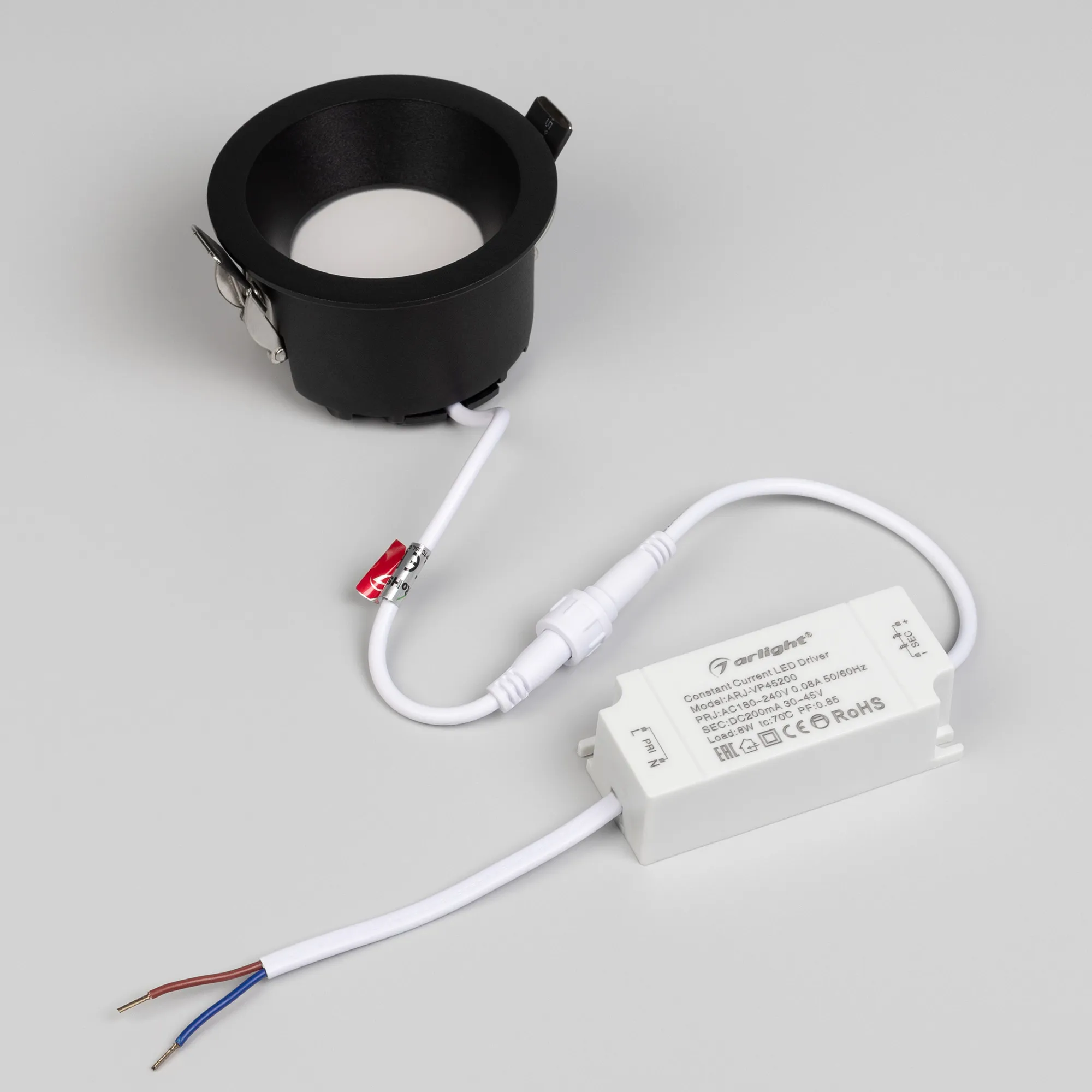 Встраиваемый светильник даунлайт. Мощность 8 Вт, св. поток 610 лм, 76 лм/Вт, тёплый 3000 K, CRI>90, угол 85°, напряжение питания 230 В. Чёрный круглый корпус из алюминия, степень защиты IP54. Размер: диаметр 84 мм, высота 49 мм. Монтаж встраиваемый, установочное отверстие: диаметр 75 мм. Драйвер IP54, 30-45 В, 200 мА, пульсация <3%.