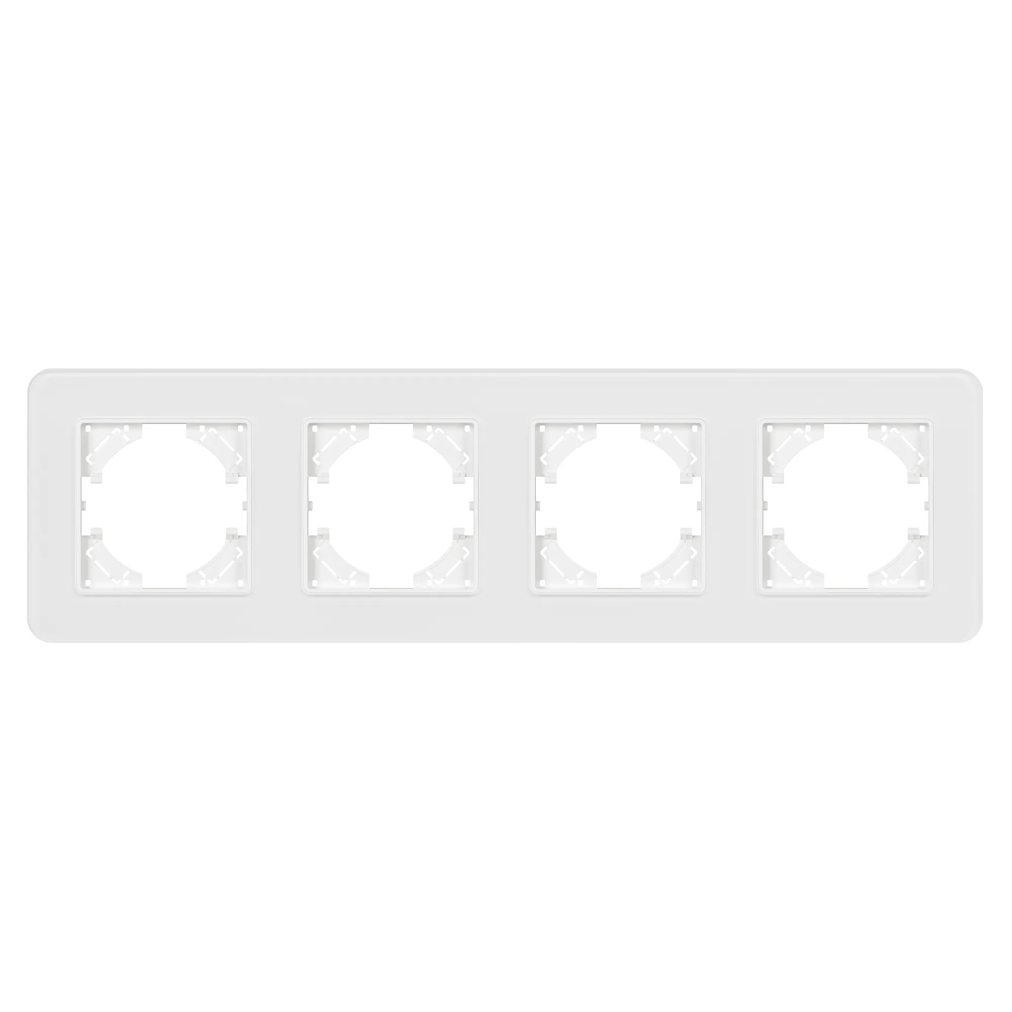 Рамка стеклянная на 4 поста, под встраиваемый механизм. Цвет - белый с Soft-Touch покрытием. Уровень герметичности IP20. Ориентация монтажа - горизонтальная (основным ориентиром служат посадочные выступы для накладки механизма).
