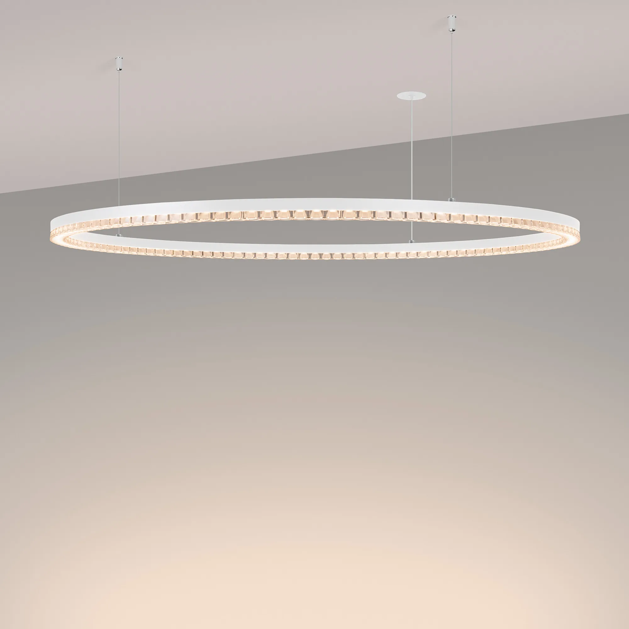 Под заказ. Подвесной светильник. Мощность 60 Вт, св. поток 5070 лм, 80-95 лм/Вт, теплый 3000 K, CRI>90, угол 45°, напряжение питания 230 В. Белый круглый корпус из алюминия, экран PMMA, степень защиты IP20. Размер: диаметр 1050 мм, высота 34 мм, ширина профиля 30 мм, размер чаши: диаметр 65 мм, высота 26 мм. Монтаж подвесной, длина подвеса 1200 мм, тип чаши встраиваемый, диаметр установочного отверстия чаши 60 мм. Драйвер (2шт.) 9-42 В, 700 мА. Пульсация <0,3 %.